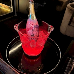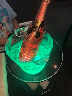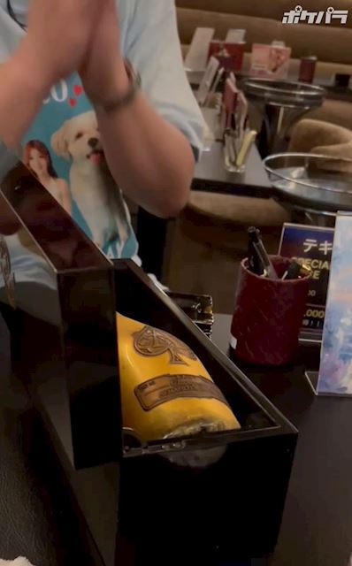 ラムちゃんカラーのシャンパン((っ•̀ ̫•́ )っ💛はっぴーだっちゃ💛最後にふりふりしてるのはミスド🍩